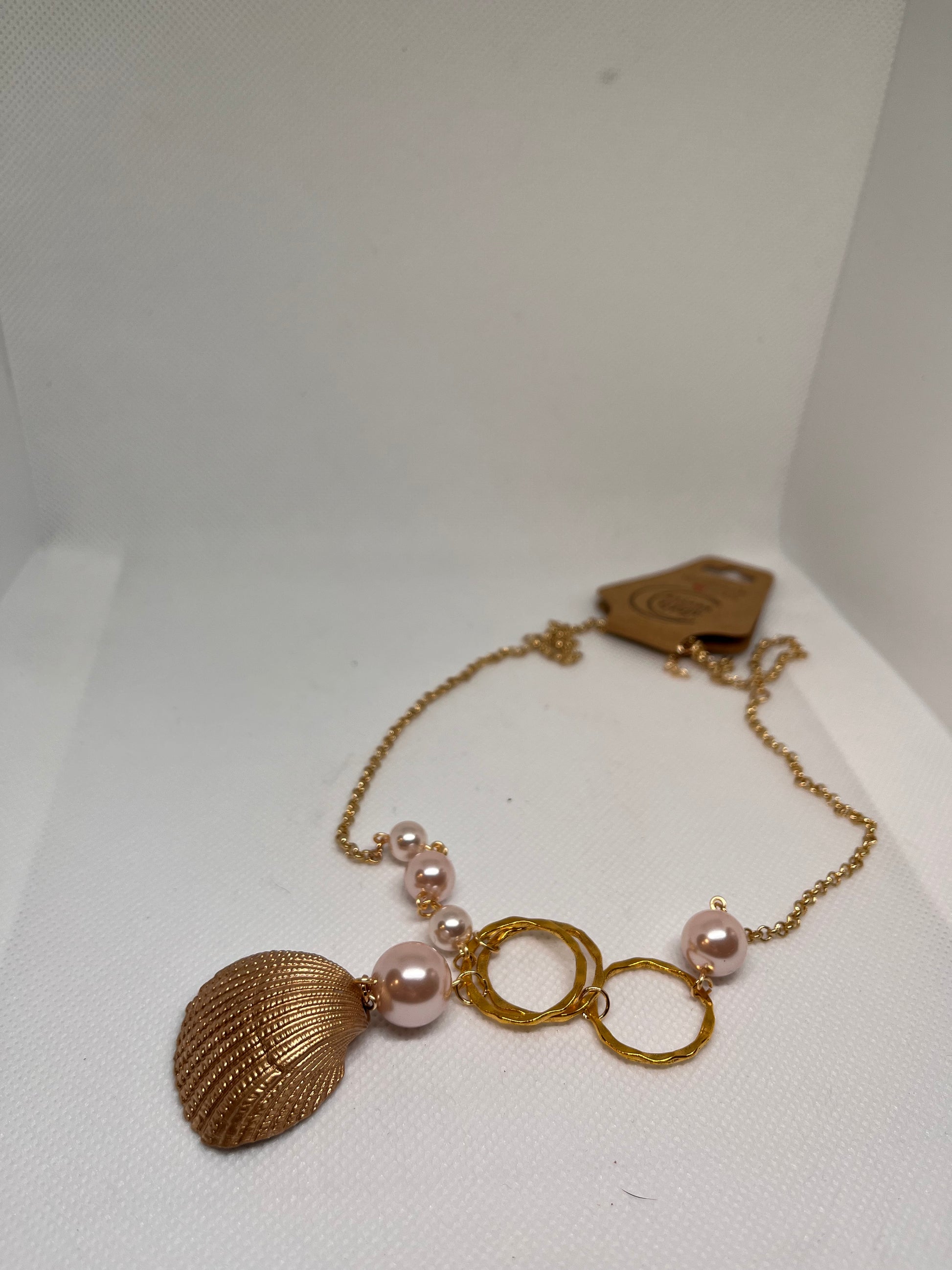 Indulge in the beauty of the ocean with this exquisite Triple Hammered Gold Circle with Pink Pearl Beads in a Gold Seashell Necklace. This unique piece combines the elegance of gold with the natural charm of seashells and pearls, creating a truly captivating accessory.