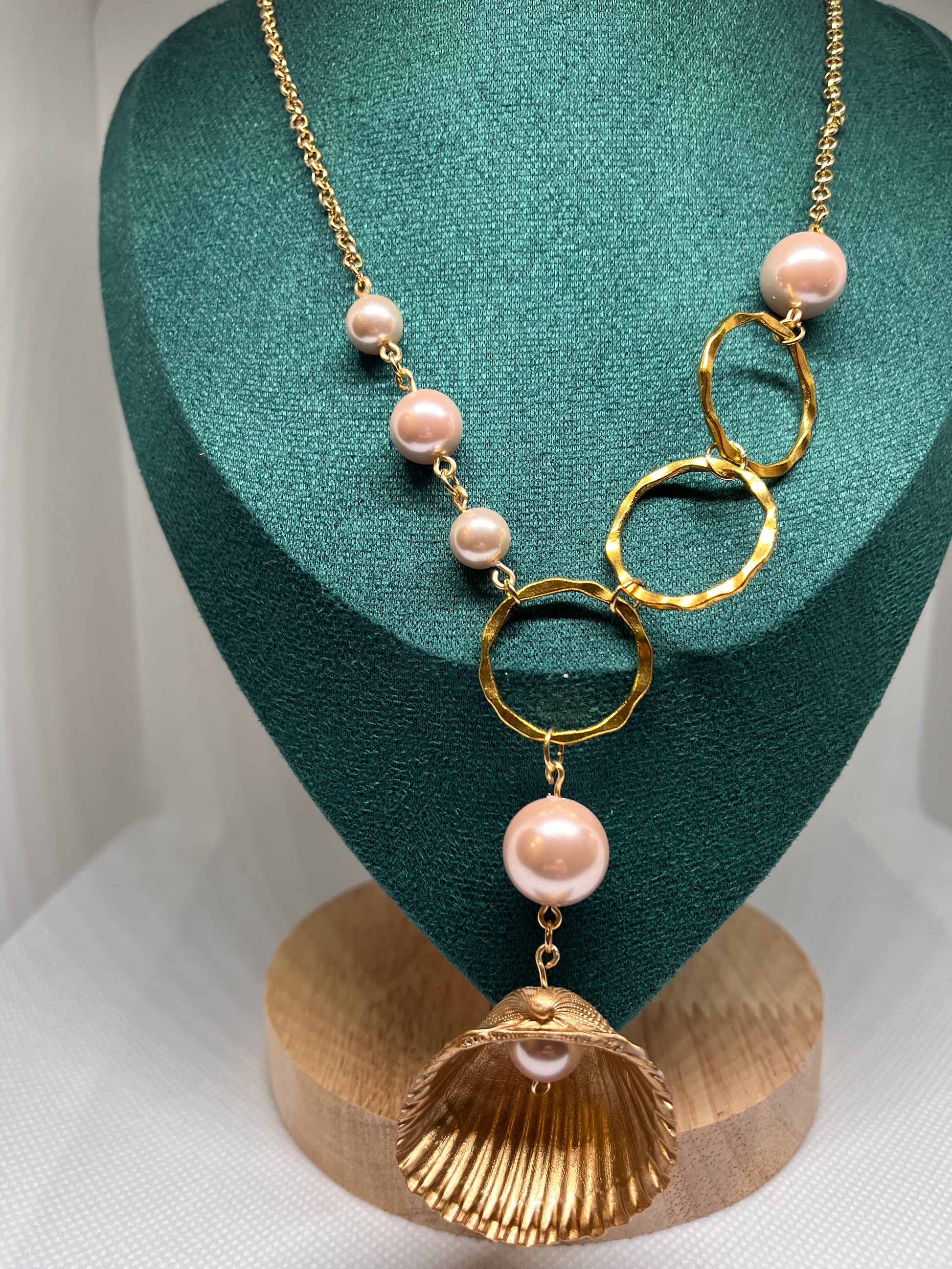 Triple Hammered Gold Circle with Pink Pearl Beads in a Gold Seashell Necklace